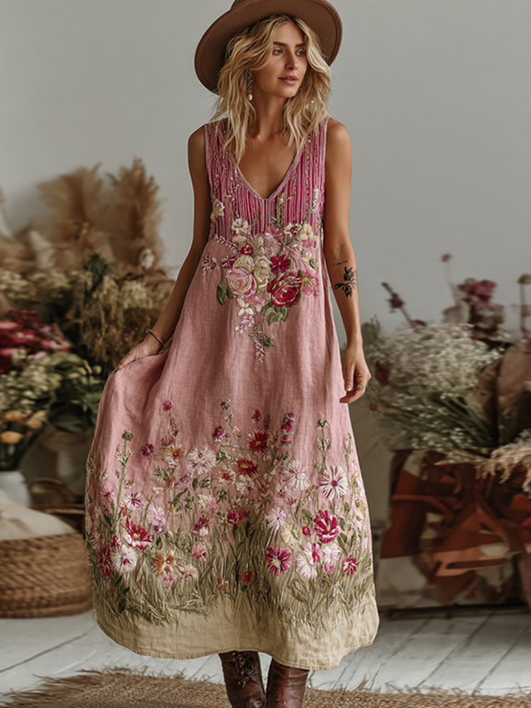 Love & Health Collection Retro Western Women Style Vintage Pink Striped And Floral Patchwork Art V Neck Linen Maxi Dress