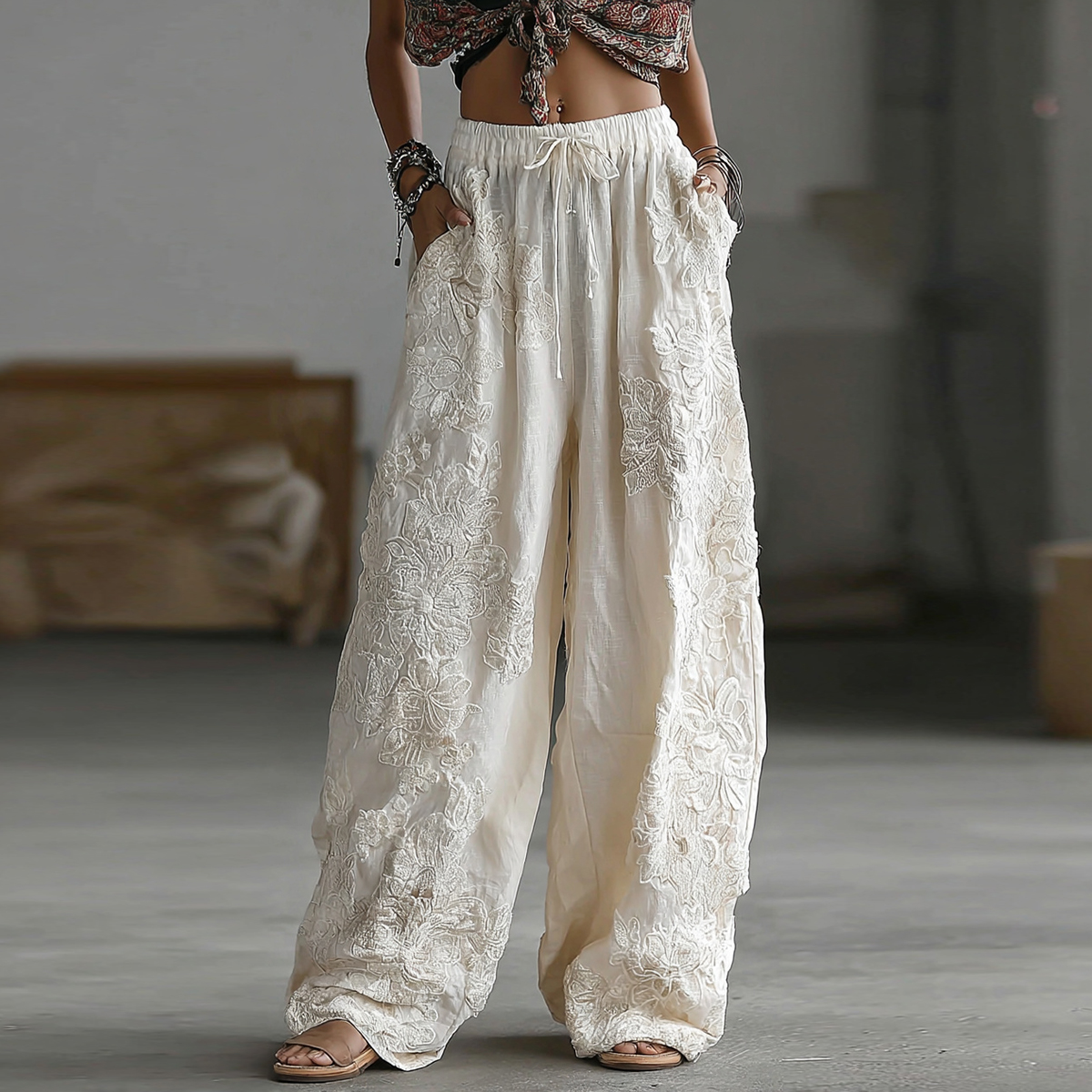 Women's Retro Floral Lace Patchwork Art Pocket Linen Pants