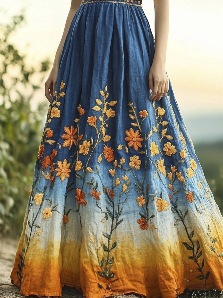 Boho Floral Embroidered Gradient Linen Maxi Dress